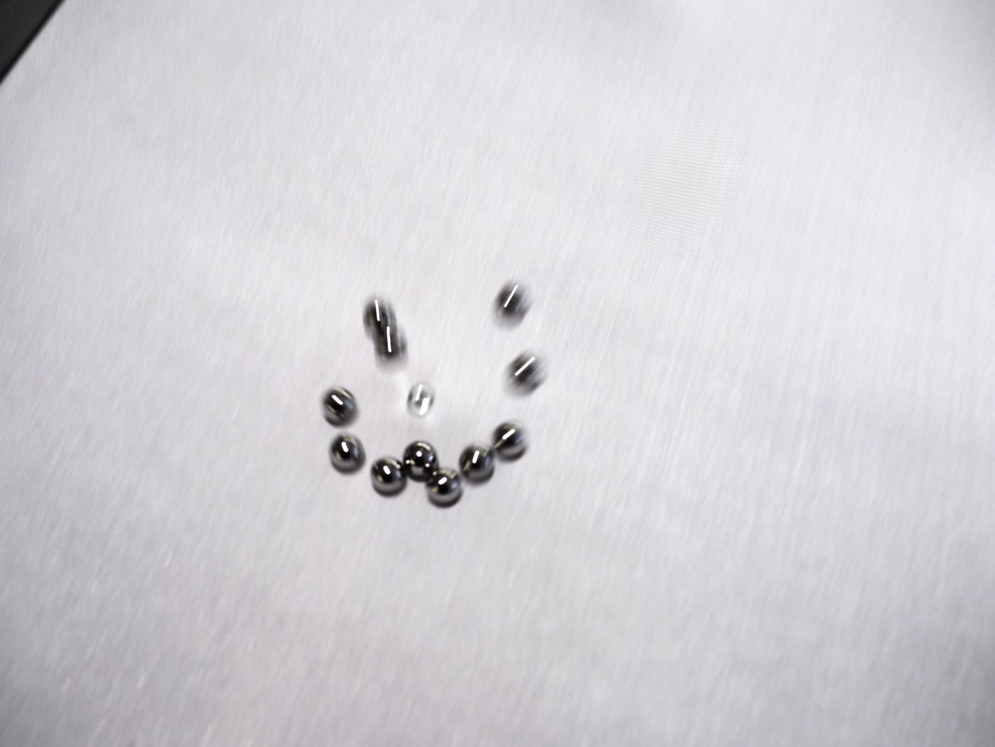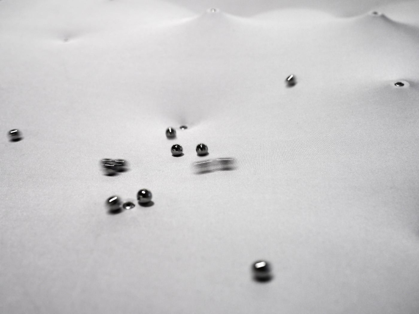 While observing the iron balls, you will notice individual behavior patterns in terms of the iron balls movements. There are loners racing over the fabric and running into others or there are groups separating rarely but having a strong cohesion. The material get part of the calculation.