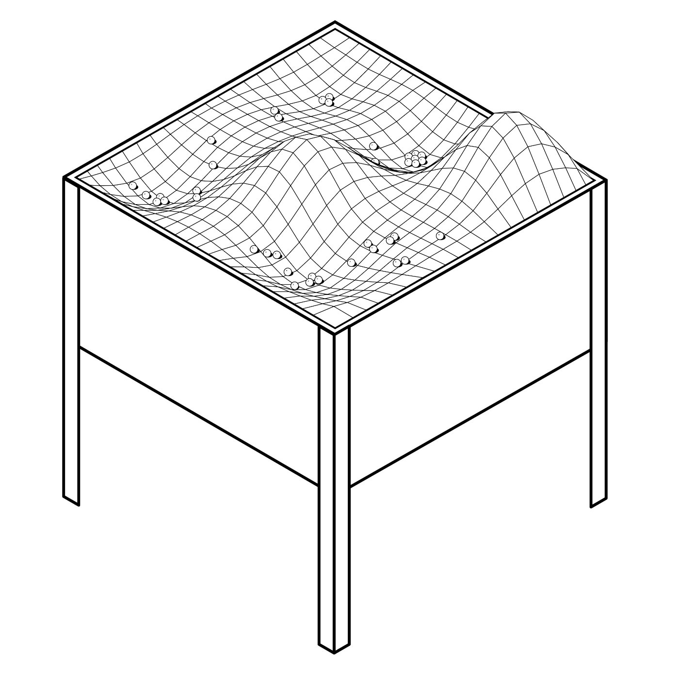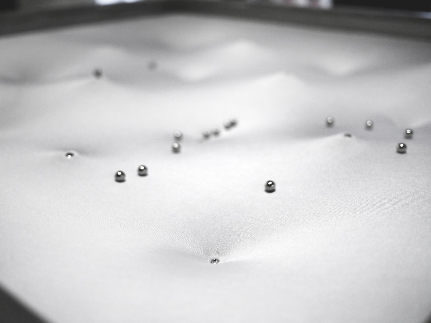 A taut fabric surface gets formed into an undulated landscape by using a grid of 16 servo motors attached to the fabric. Due to gravitation a certain amount of small iron balls placed on top of the fabric are set in motion.